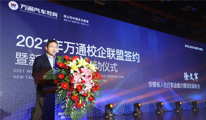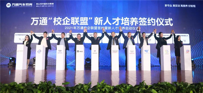 4月22日,技新天下 共贏未來——2021年萬通汽車教育校企聯盟簽約暨新人才培養啟動儀式在安徽合肥盛大舉行。安徽省人社廳職業能力建設處副處長徐文軍、中國東方教育集團汽車事業部總經理陶青、中國汽車工程學會應用服務分會副理事長張國方、中國東方教育集團汽車事業部常務副總經理李永朋、奇瑞汽車股份有限公司副總經理李康、江淮蔚來新能源汽車有限公司人力資源總經理張宇、寧波馳田貿易集團有限公司董事長徐敏俠、安徽航鷹無人機技術服務有限公司董事長許克濤、瑞意通用航空服務有限公司總經理郭禹彤,以及長安汽車、埃夫特智能設備、長城汽車、吉利汽車、上汽車享家、米其林馳加、風之星汽車、途虎養車、新奇特車業、浙江廣成汽車集團、江蘇大有汽車貿易等幾十家企業共同出席本次活動。