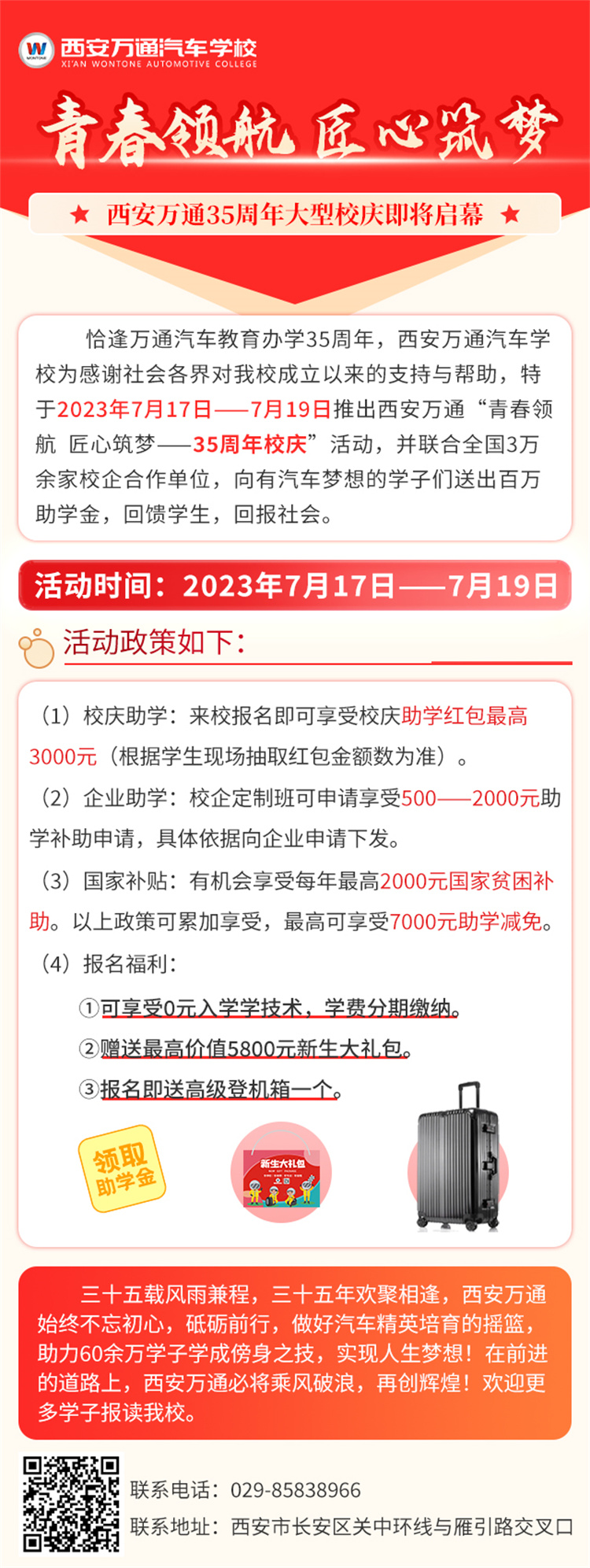恰逢萬通汽車教育辦學(xué)35周年,西安萬通汽車學(xué)校為感謝社會各界對我校成立以來的支持與幫助,特于2023年7月17日——7月19日推出西安萬通“青春領(lǐng)航 匠心筑夢——35周年校慶”活動,并聯(lián)合全國3萬余家校企合作單位,向有汽車夢想的學(xué)子們送出百萬助學(xué)金,回饋學(xué)生,回報社會。